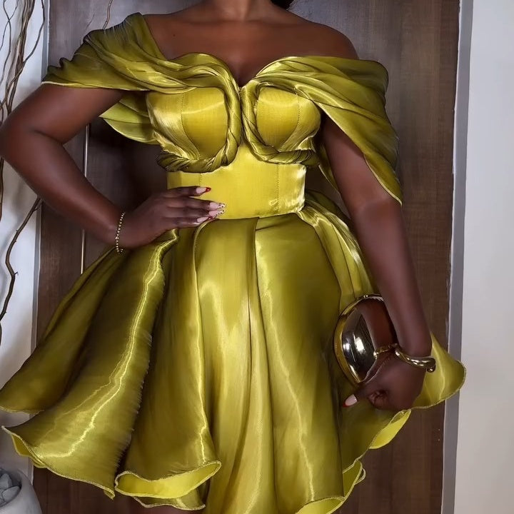 The Cocktail dress is a captivating and elegant choice for any special occasion. Available in dazzling Gold and Blue hues, this A-line silhouette features an alluring off-the-shoulder neckline that adds a touch of drama and sophistication. The sleeveless design allows for graceful movement, while the liquid organza fabric flows effortlessly, offering a smooth and refined finish. Secured with a back zipper and hook closure, this cocktail dress is easy to wear and guarantees a flattering fit throughout the evening. Whether it’s a cocktail party, evening gala, or formal event, you’ll step in and capture unforgettable moments with style and confidence.