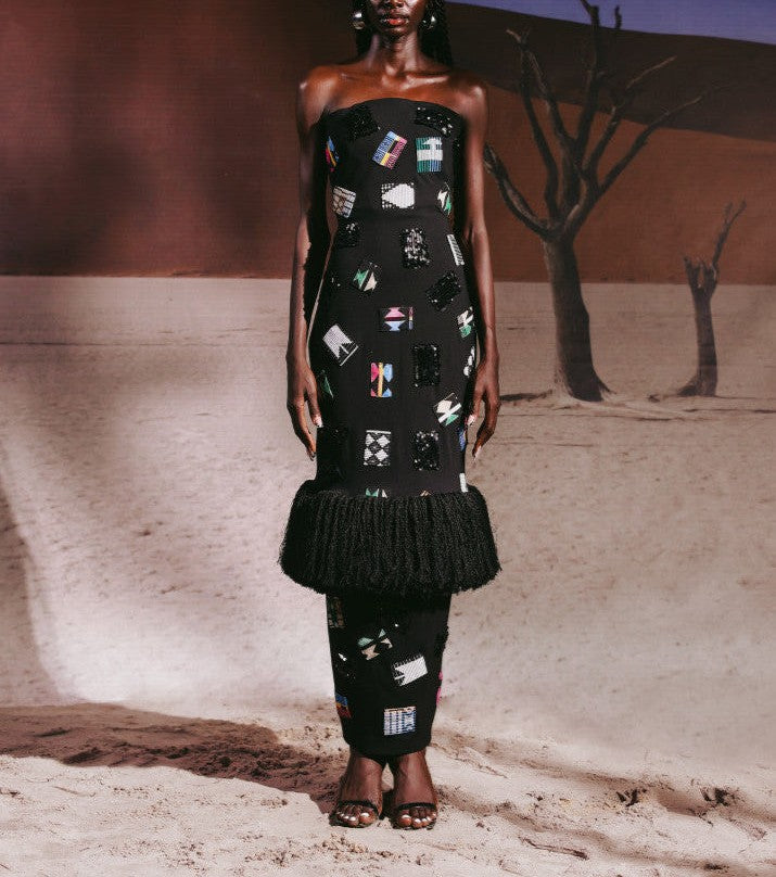 Bold, vibrant, and full of character, the Adora Patchwork Dress is a stunning fusion of color, texture, and movement. This strapless masterpiece is designed to hug the body in a flattering silhouette, while the colorful patchwork detailing adds a playful yet opulent touch. The cascading fringe hem creates dynamic movement, ensuring you command attention with every step. Whether for a red carpet event, cocktail party, or an elevated night out, the Adora Patchwork Dress is a true statement piece.