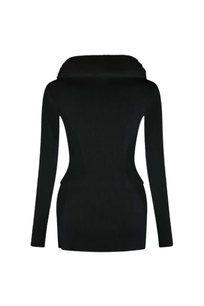 Rib knit cardigan top with detachable fur collar trim design