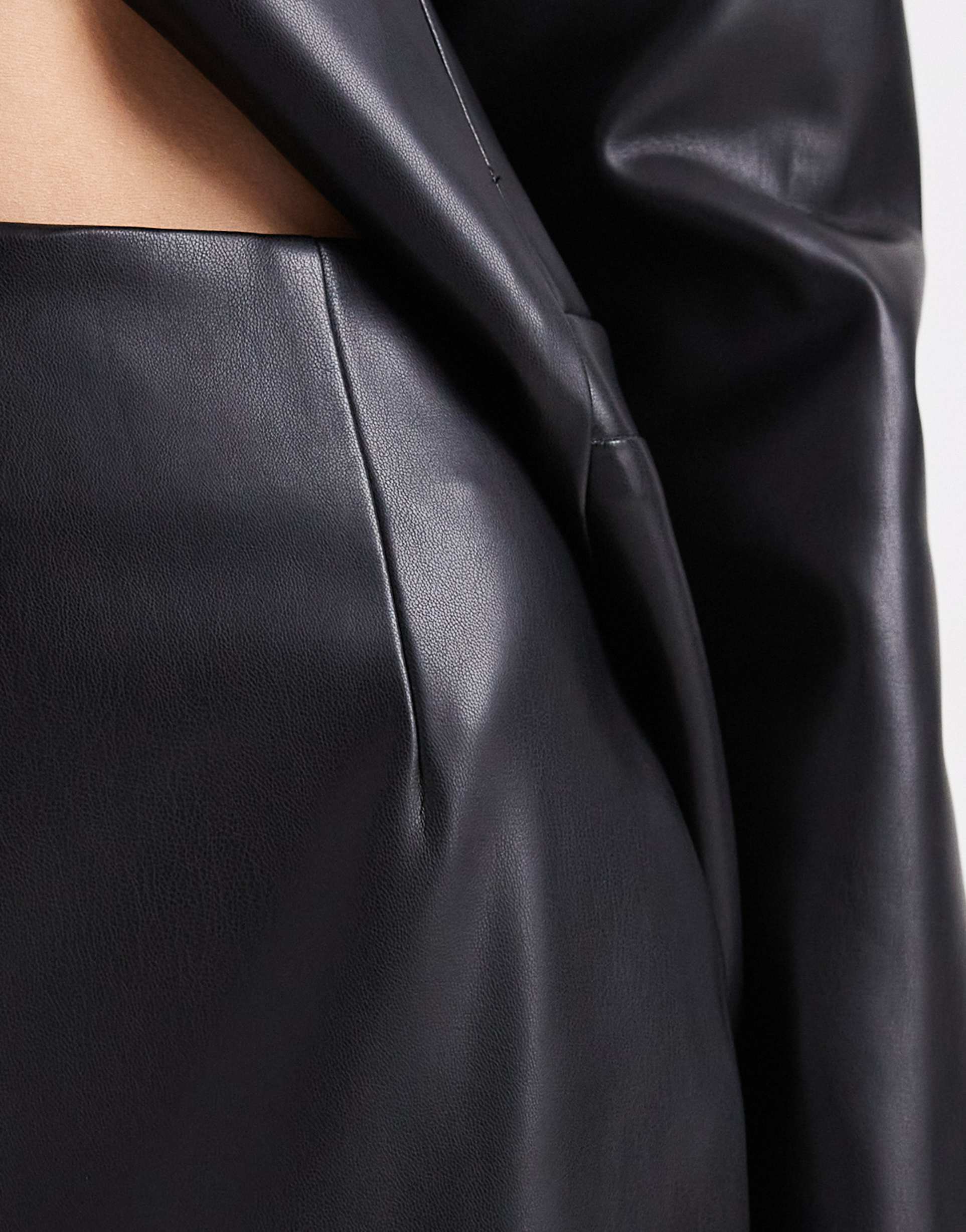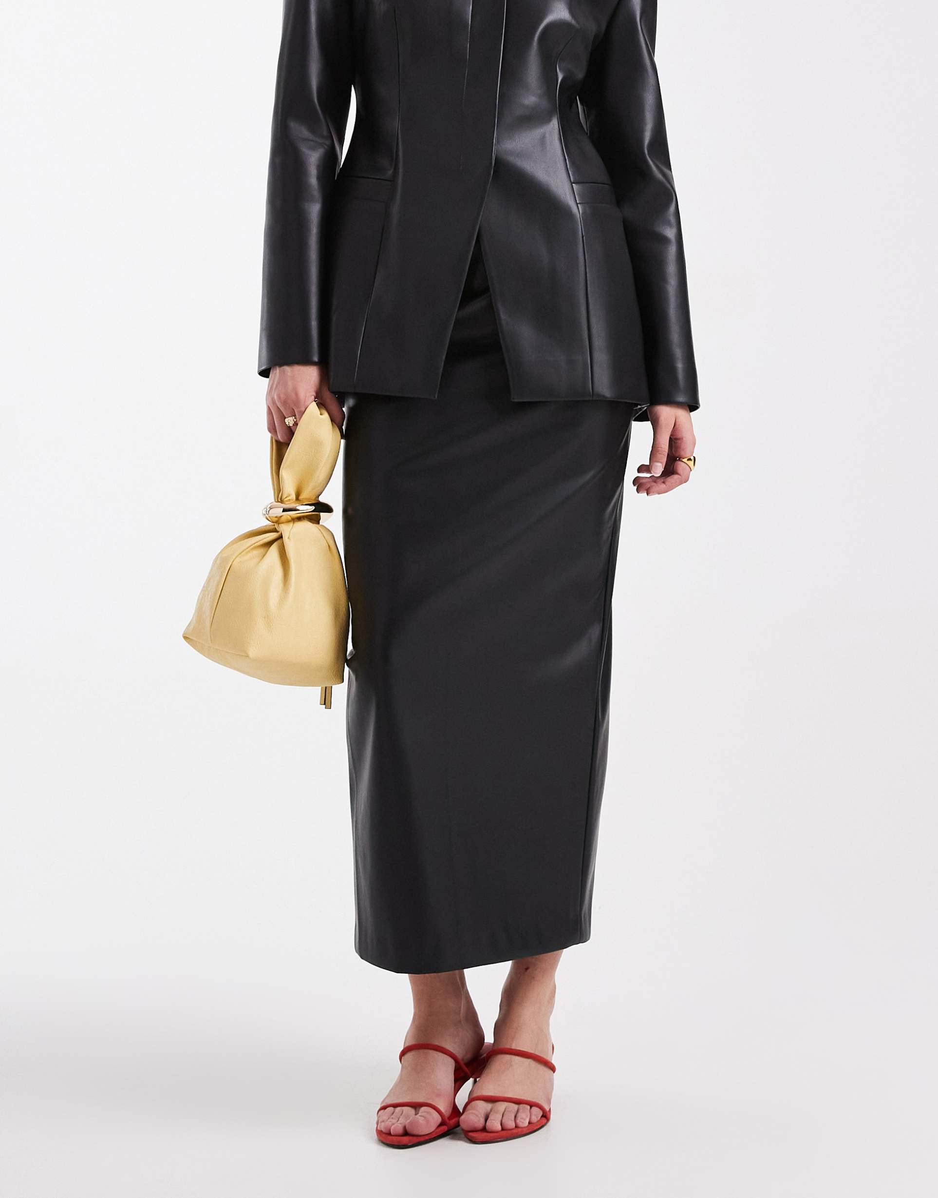 Black Faux Leather Structured Blazer & Midi Skirt Set