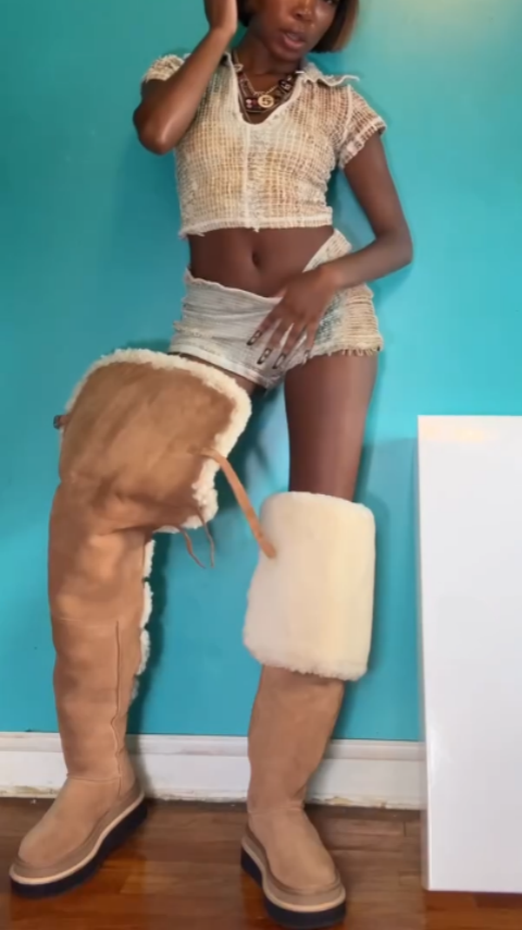 - Design & Style: Features an over-the-knee silhouette, shearling lining, detachable shearling panels with buckle details, and a chunky platform sole. It offers multiple styling options—wear as full over-the-knee boots, convert to mid-calf boots with detachable panels, or adjust the panels for ruffled textures—blending cozy shearling comfort with versatile, fashion-forward design.