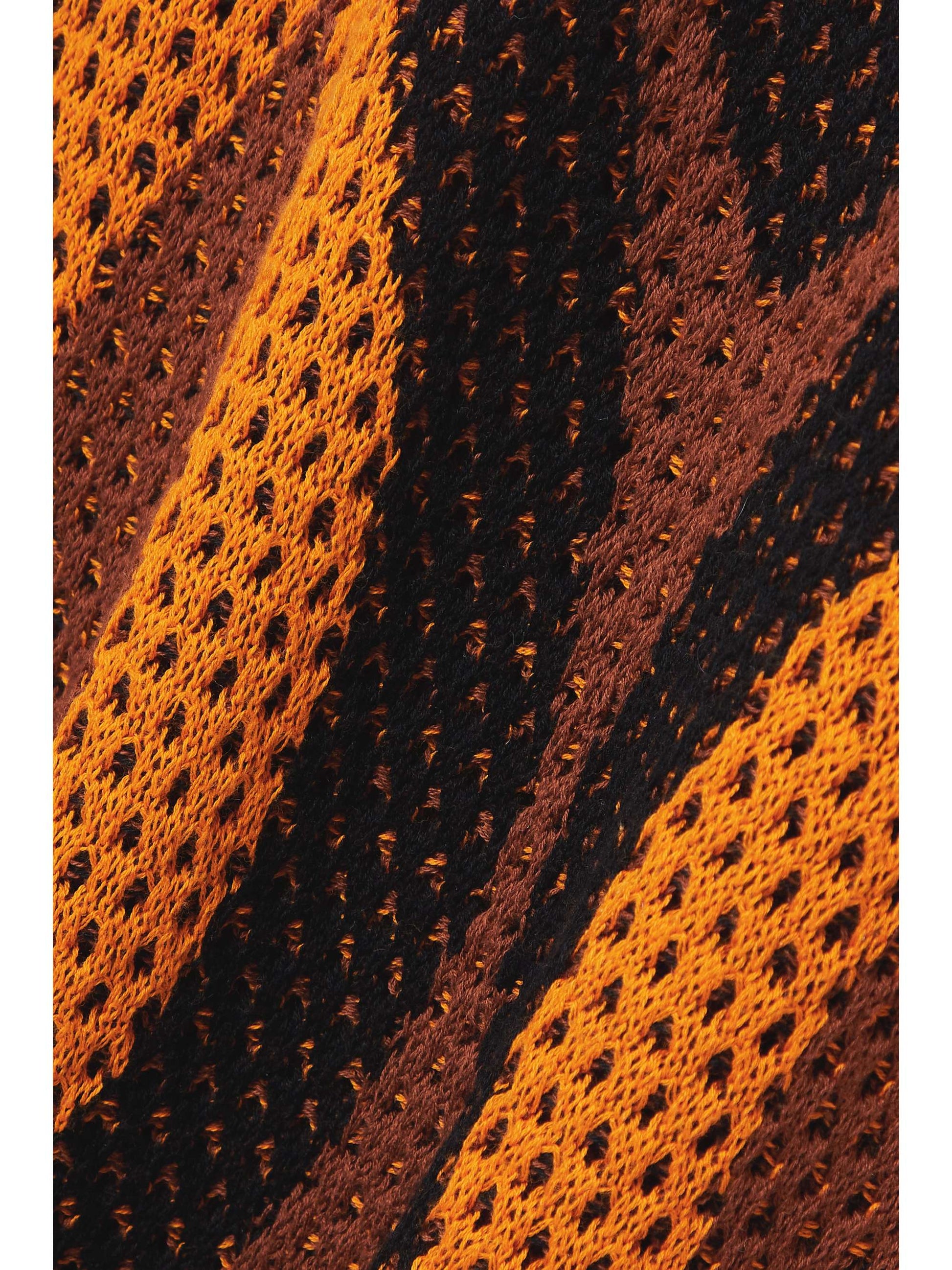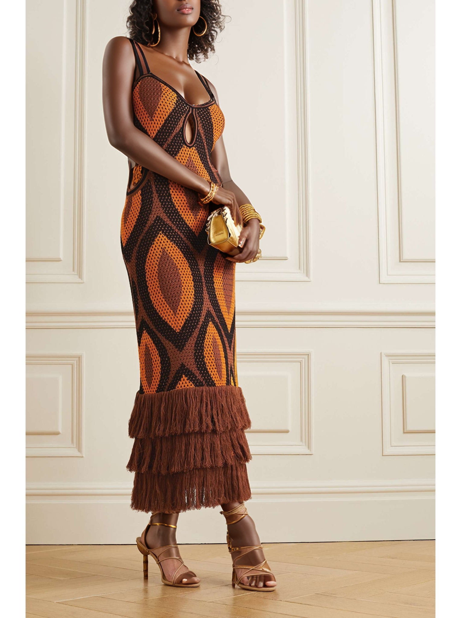 This maxi dress features a honeycomb structure and a tonal geometric pattern. It has a cut-out bodice and a midi-length hem with layers of flowing fringe. Pair it with gold accessories for a luxe look.