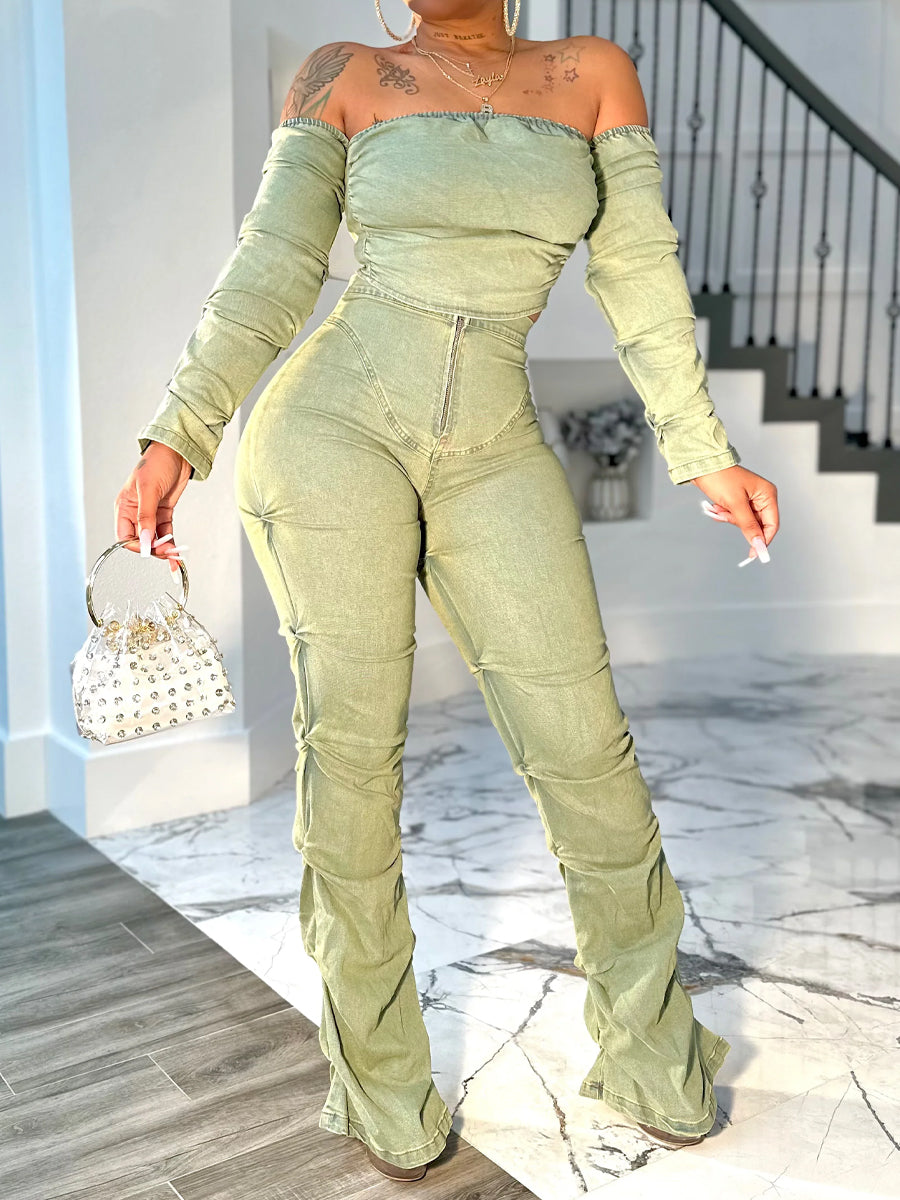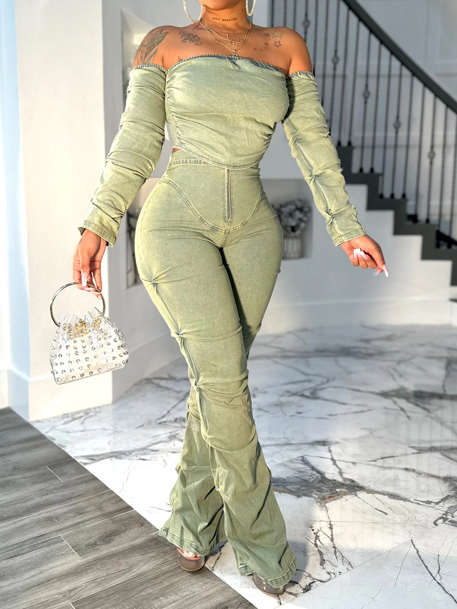 Denim Off Shoulder Two Pieces Set