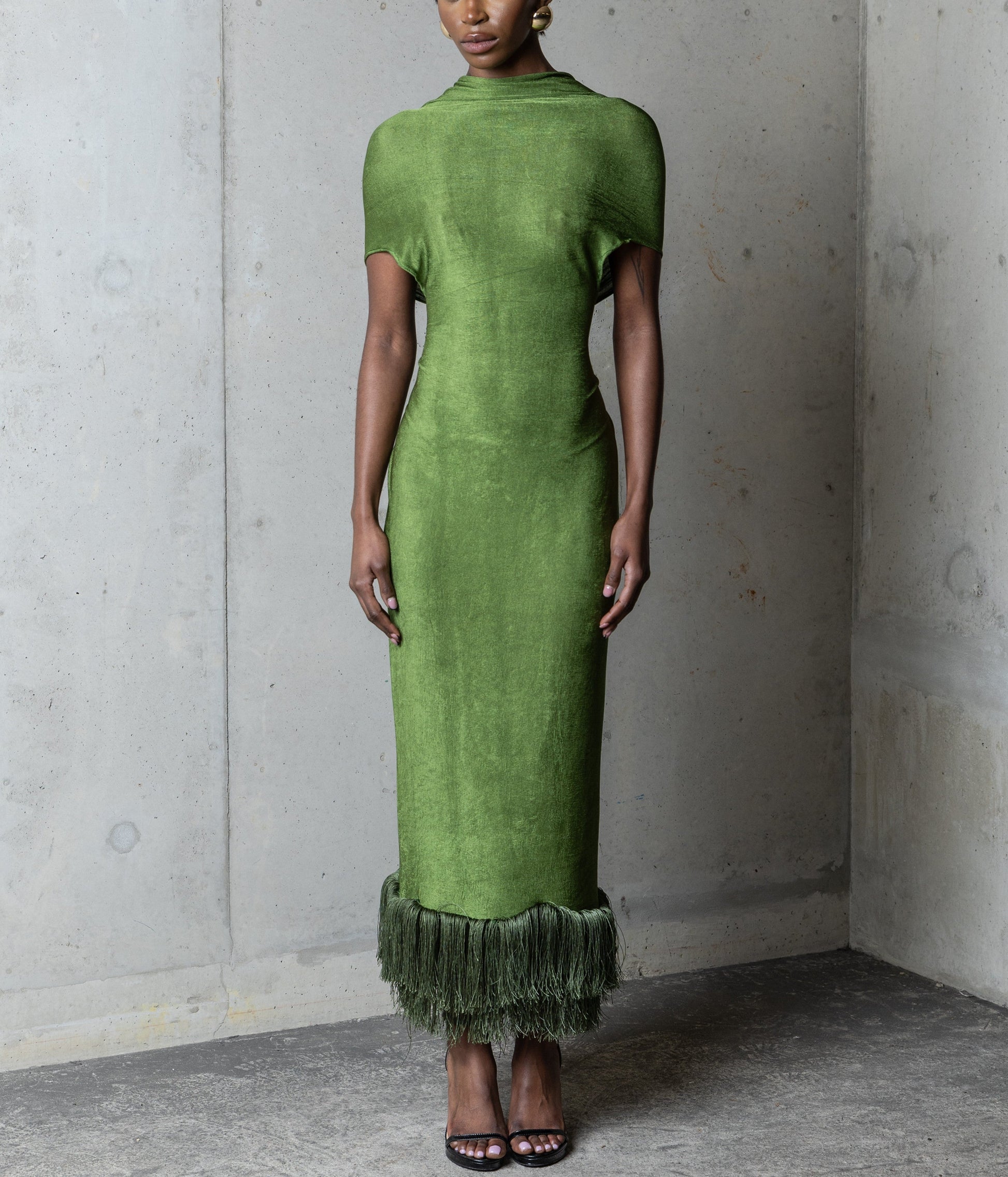 This elegant green dress, chic cocktail dress features a high neckline and a dramatic open back with a striking circular wooden detail that adds a unique touch. The silhouette is sleek and sophisticated, hugging the figure while offering a graceful drape. The hem is adorned with delicate fringes, giving the dress a refined yet playful movement. Perfect for making a statement, this design combines elegance with eye-catching, modern details.