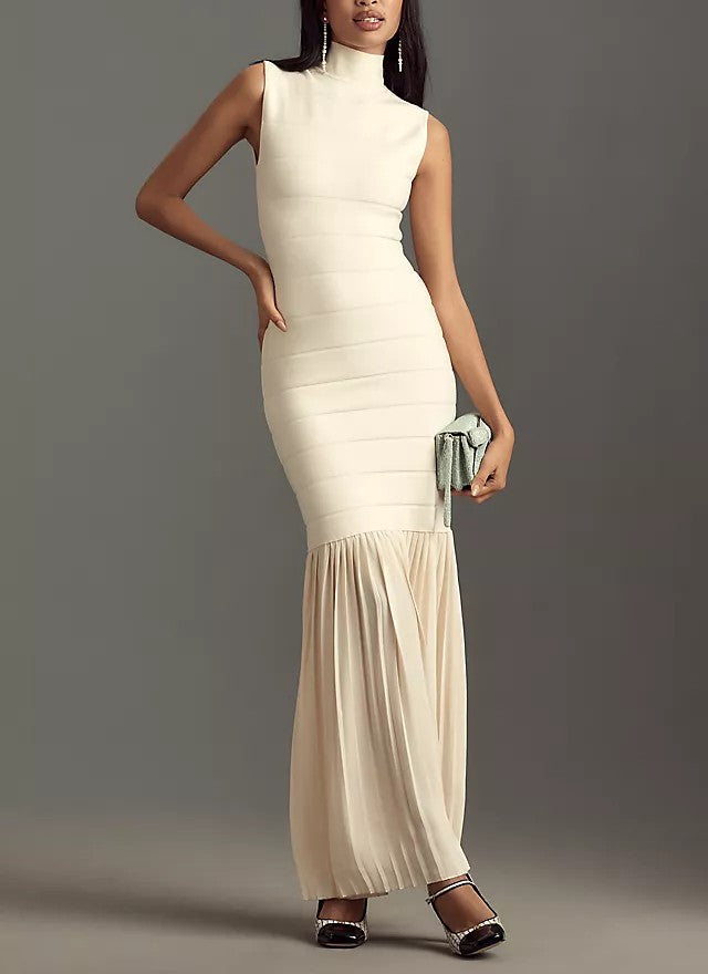 High Neck Fitted Pleated Maxi Dress