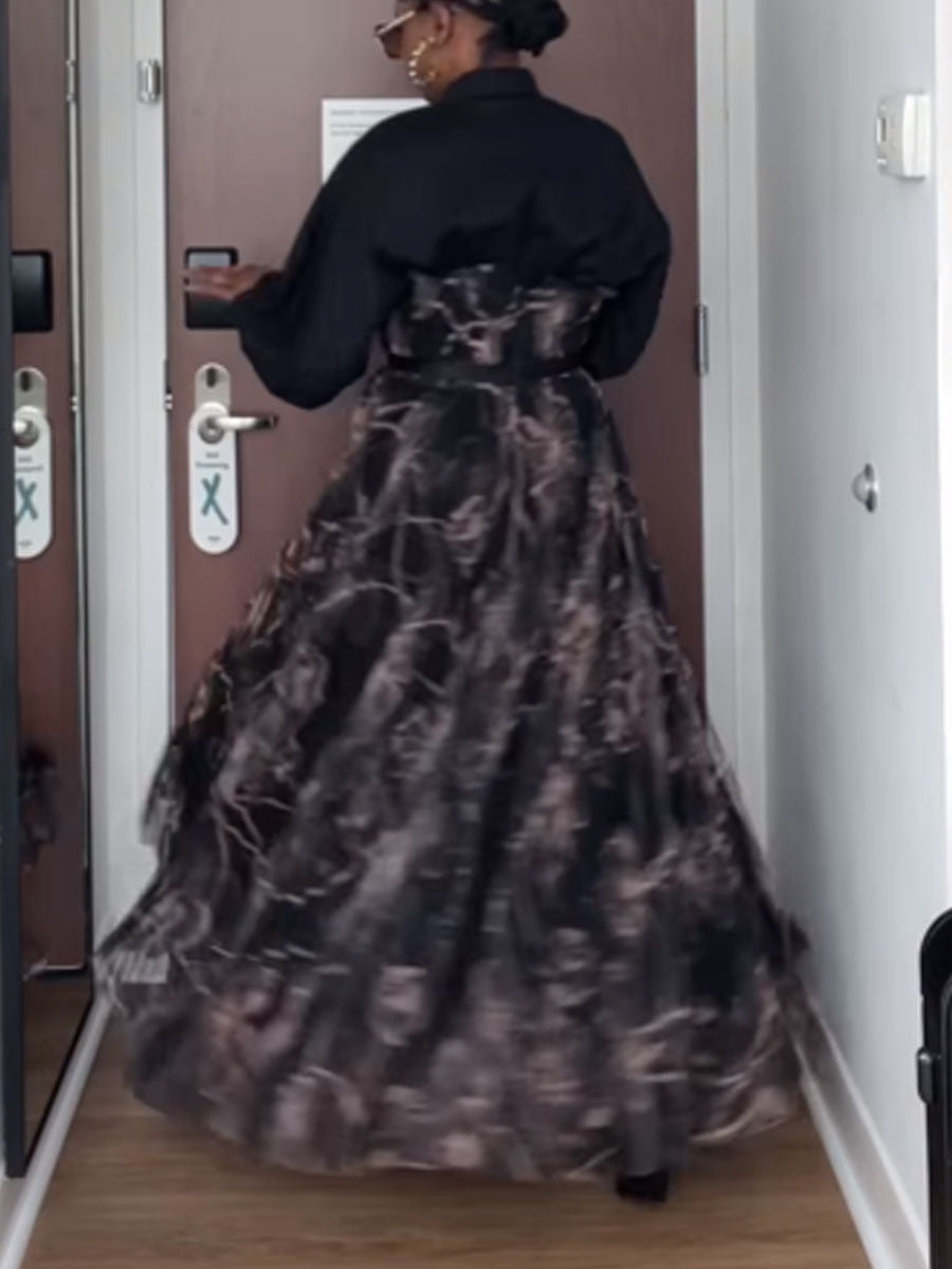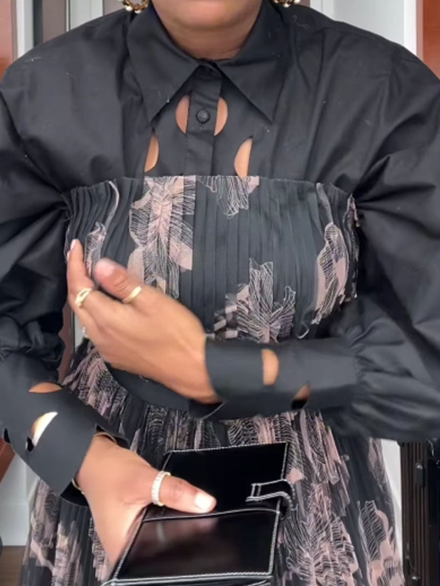 - Layered Design: Combines a black shirt with cutout details and a floral - printed tulle maxi dress, creating a stylish layered look that's both elegant and unique.