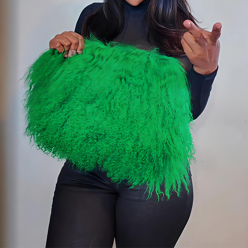 - Design & Style: Features a plush, curly faux fur exterior, structured top-handle design, and a bold, eye-catching aesthetic. The design blends luxury-inspired texture with playful, vibrant color options, making it a statement accessory for any outfit.