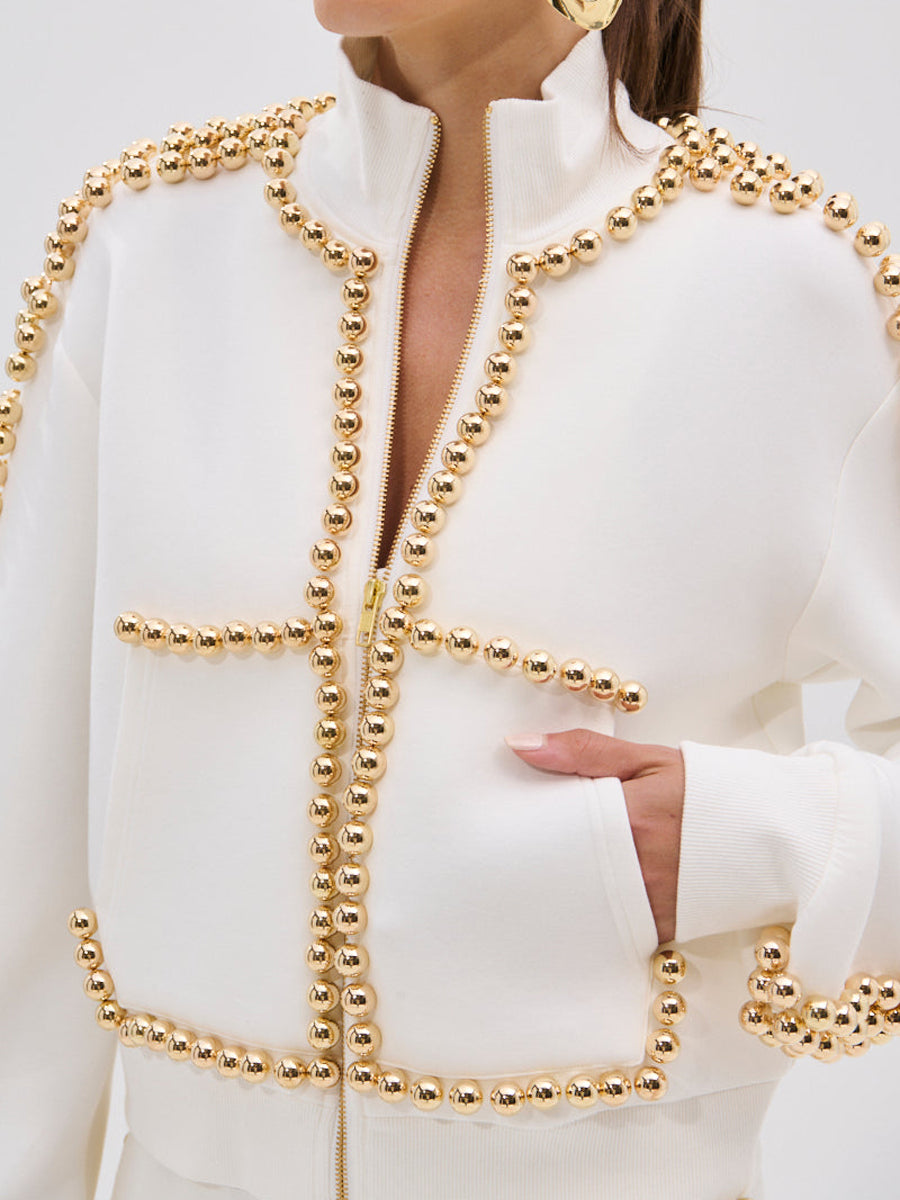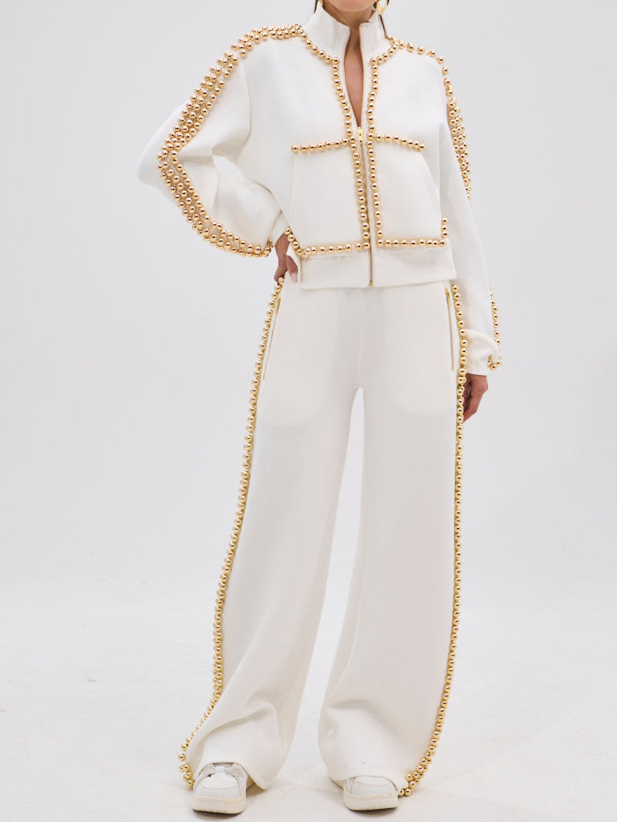 - Design & Style: Features a white base with intricate gold bead detailing along the seams, pockets, and edges, a cropped zip-up jacket, and matching wide-leg pants. The design blends sporty loungewear elements with opulent gold accents, creating a bold, red-carpet-worthy look that balances comfort and glamour.