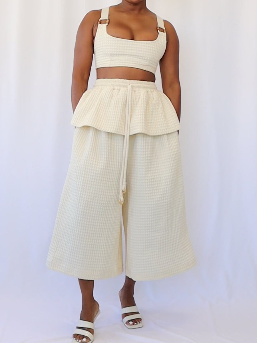 Breezy, elegant, and made for golden hour getaways — the Willow Pant brings vacation-ready ease with a polished twist. Crafted in a textured cream fabric, this wide-leg silhouette flows effortlessly while offering all-day comfort.
