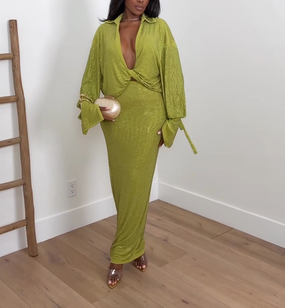 Rhinestone Mesh Loose Top Bodycon Skirt Two-Piece Set