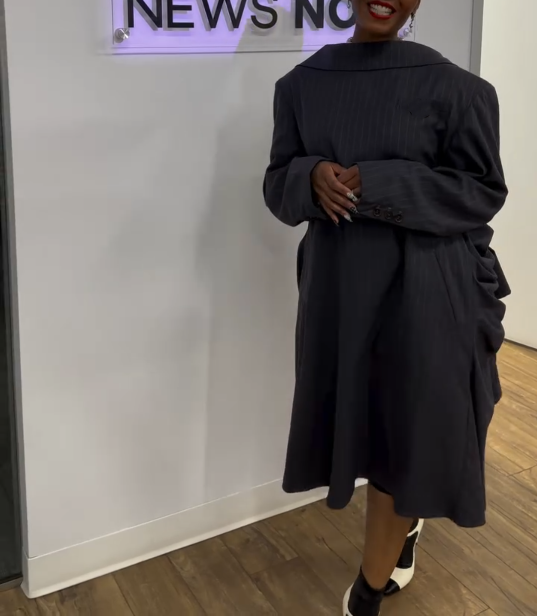 - Design & Style: Features a symmetric design with ruffled details, creating a balanced and stylish look. The backless element, paired with a checkered inner lining, forms a striking contrast and showcases a bold, distinctive style. The long length and tailored fit lend an elegant silhouette.
