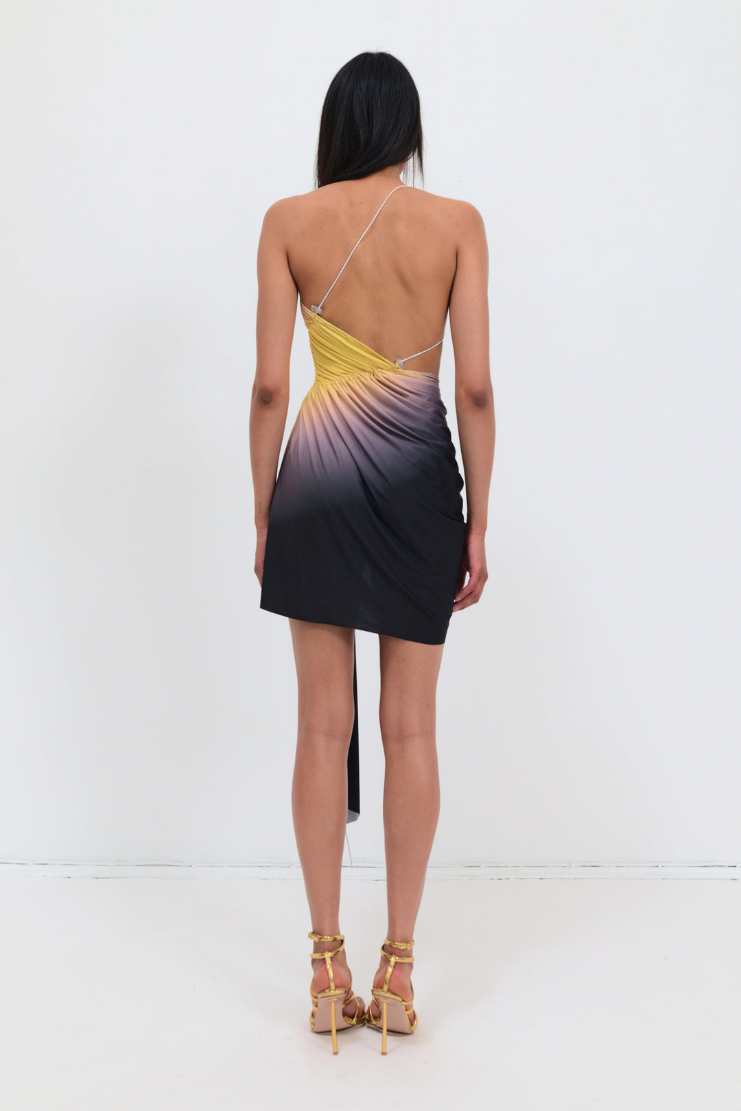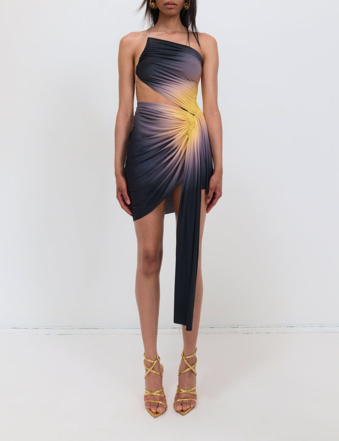 Fashioned entirely by draping a single piece of fabric onto a mannequin, the dress undergoes evolution with each successive collection. The hand-pulled elastic bands and the manual draping process underscore our attention to detail. Its cascading form is thoughtfully designed to enhance the body's natural curves in an effortlessly elegant manner, reflecting our dedication to both elegance and sexiness.