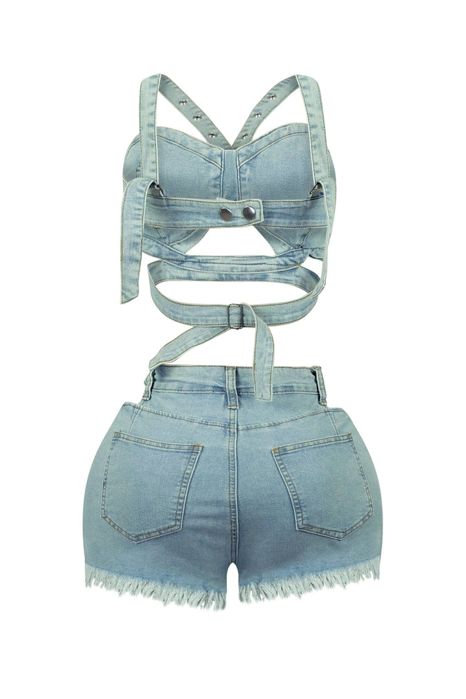 Matching high rise mini skirt set featuring cut out and frayed hem detail