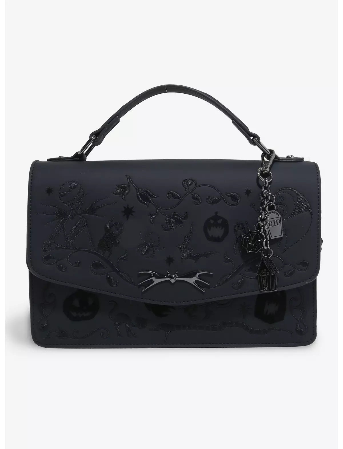Prep for spooky season with this Nightmare Before Christmas crossbody bag! Featuring velvet, embroidered, and embossed details of Halloween Town residents and icons from the film, the front flap of this bag includes a metal bat charm. With a removable multi-charm keychain, a top handle, and a removable crossbody strap, this purse is perfect for fans of the Disney film.