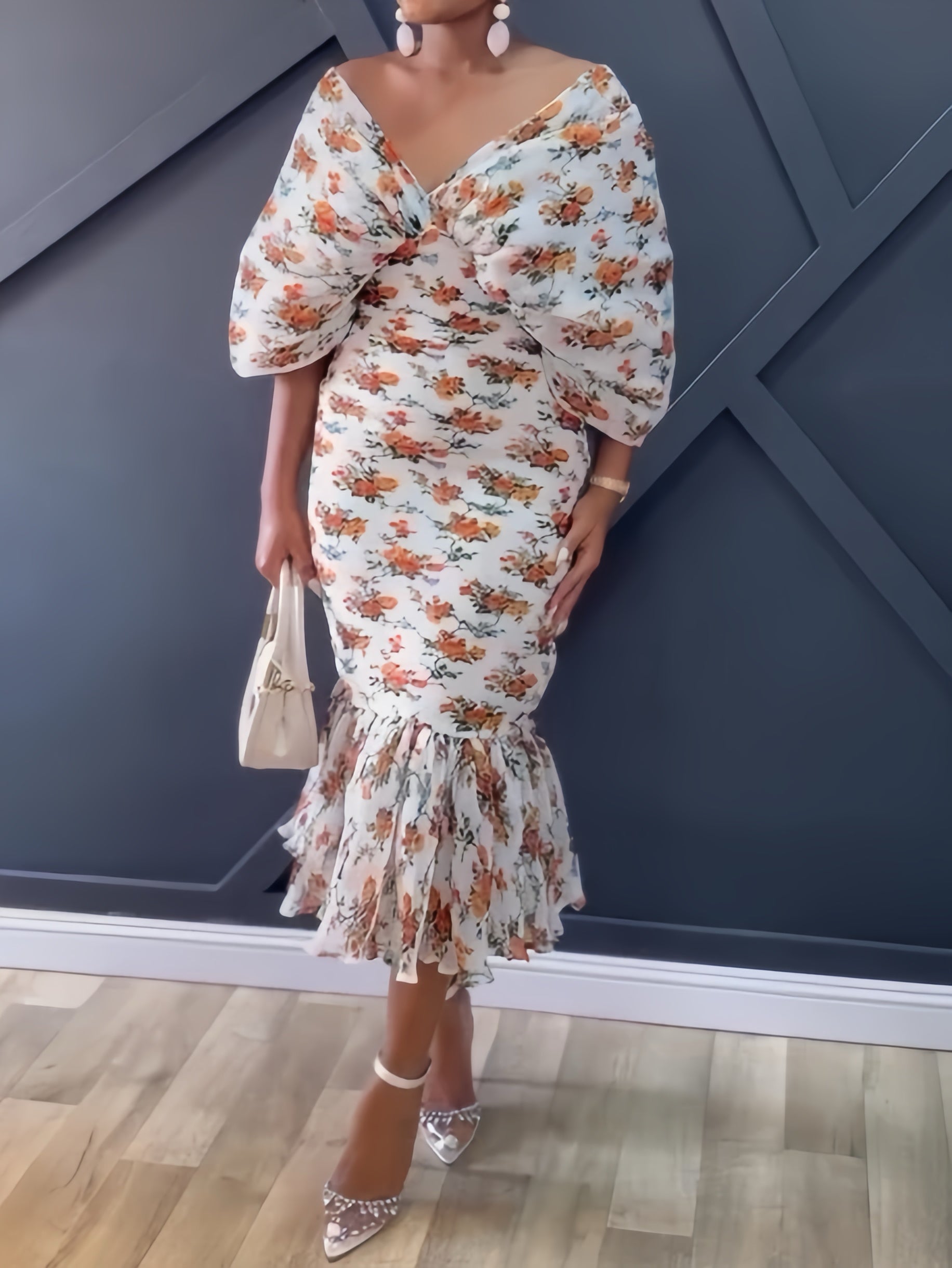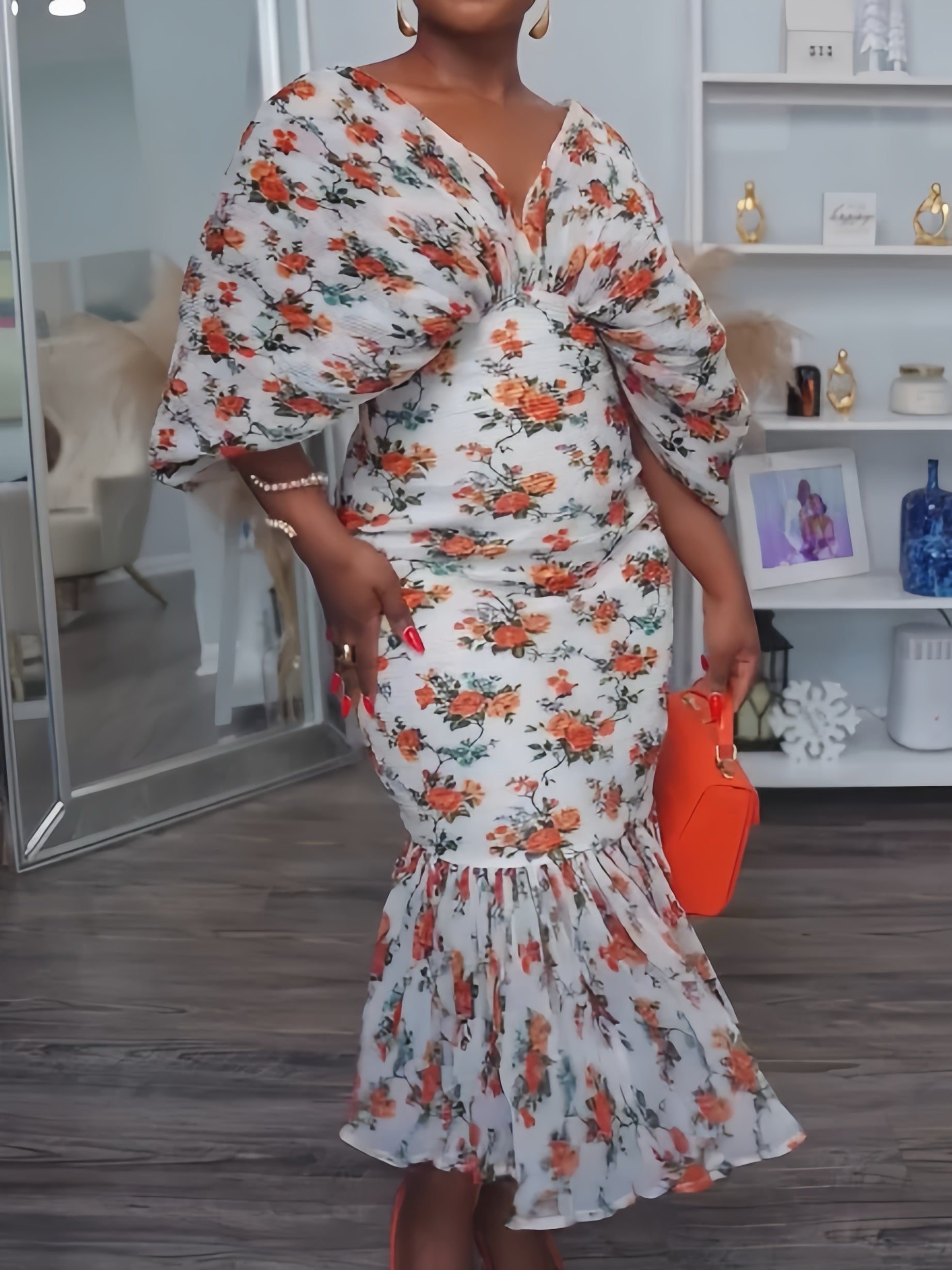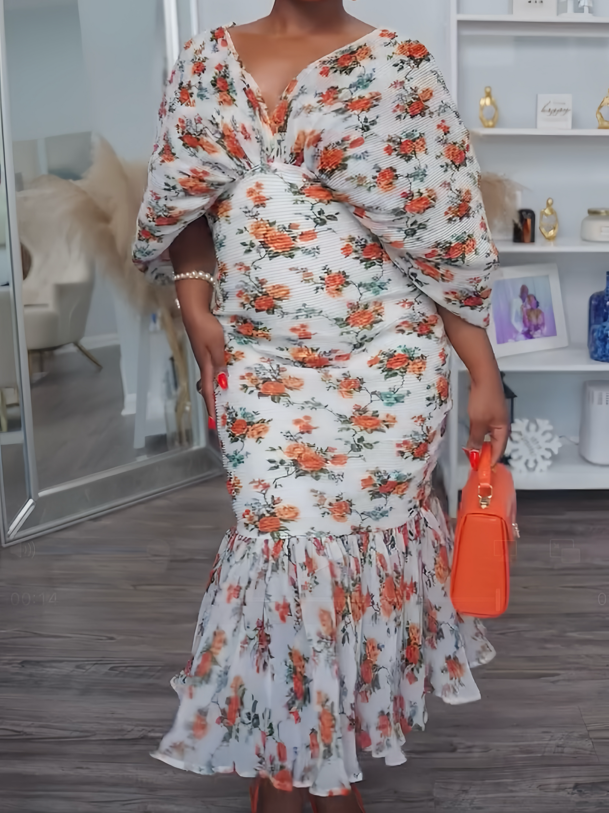 Elevate your style with the Elegant Pleated Sleeve Printed Maxi Dress, featuring a flattering silhouette with voluminous sleeves and a dramatic flared hem. The form-fitting design accentuates the waist, while the ruffled hem adds a touch of playful elegance.